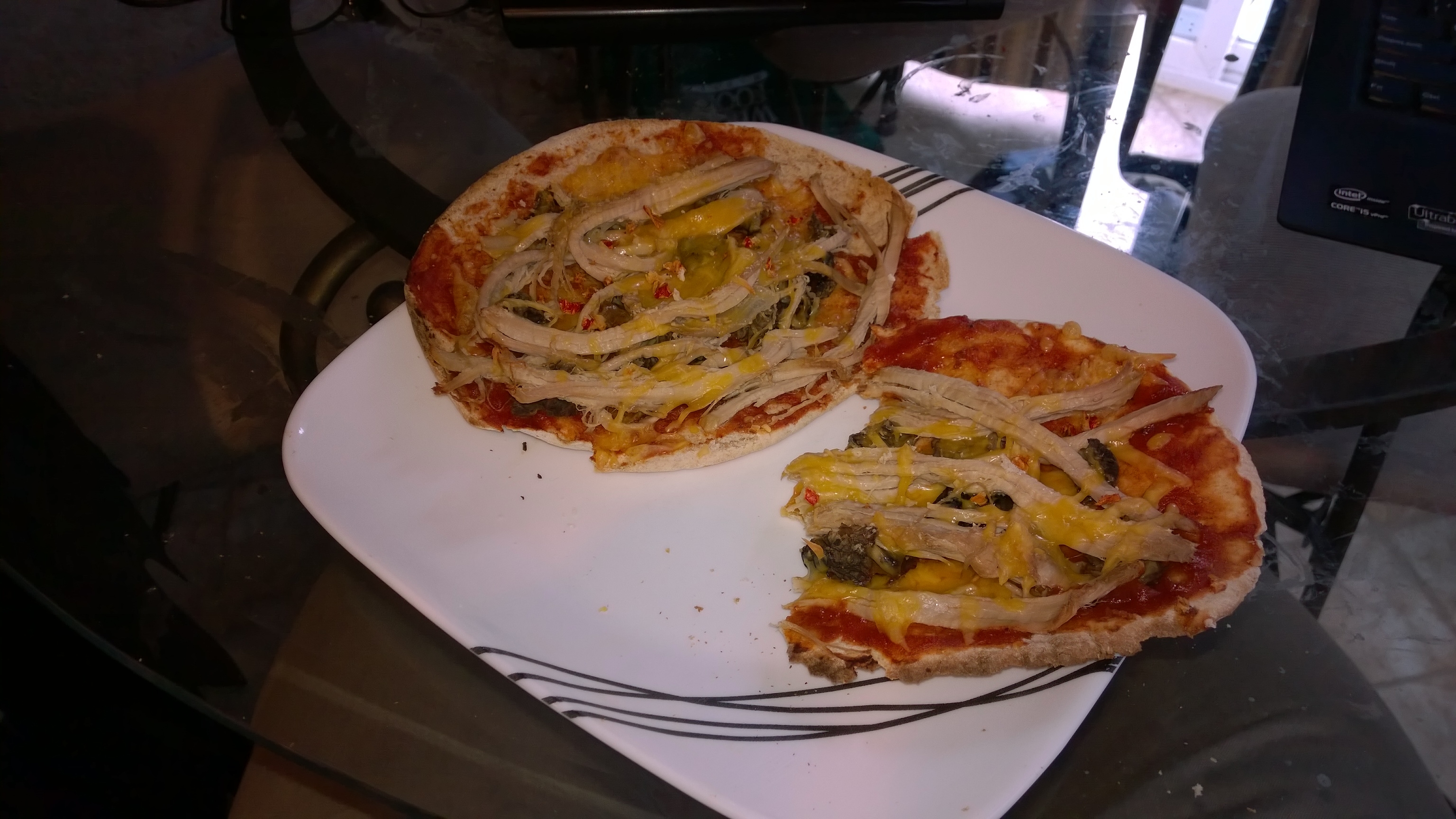 PorkPizza.jpg Published March 8, 2014 at 3072 × 1728 in March 8th Day of Eating Next → Pork, Contadina Pizza sauce, split pita, 2% cheese, and mushrooms.