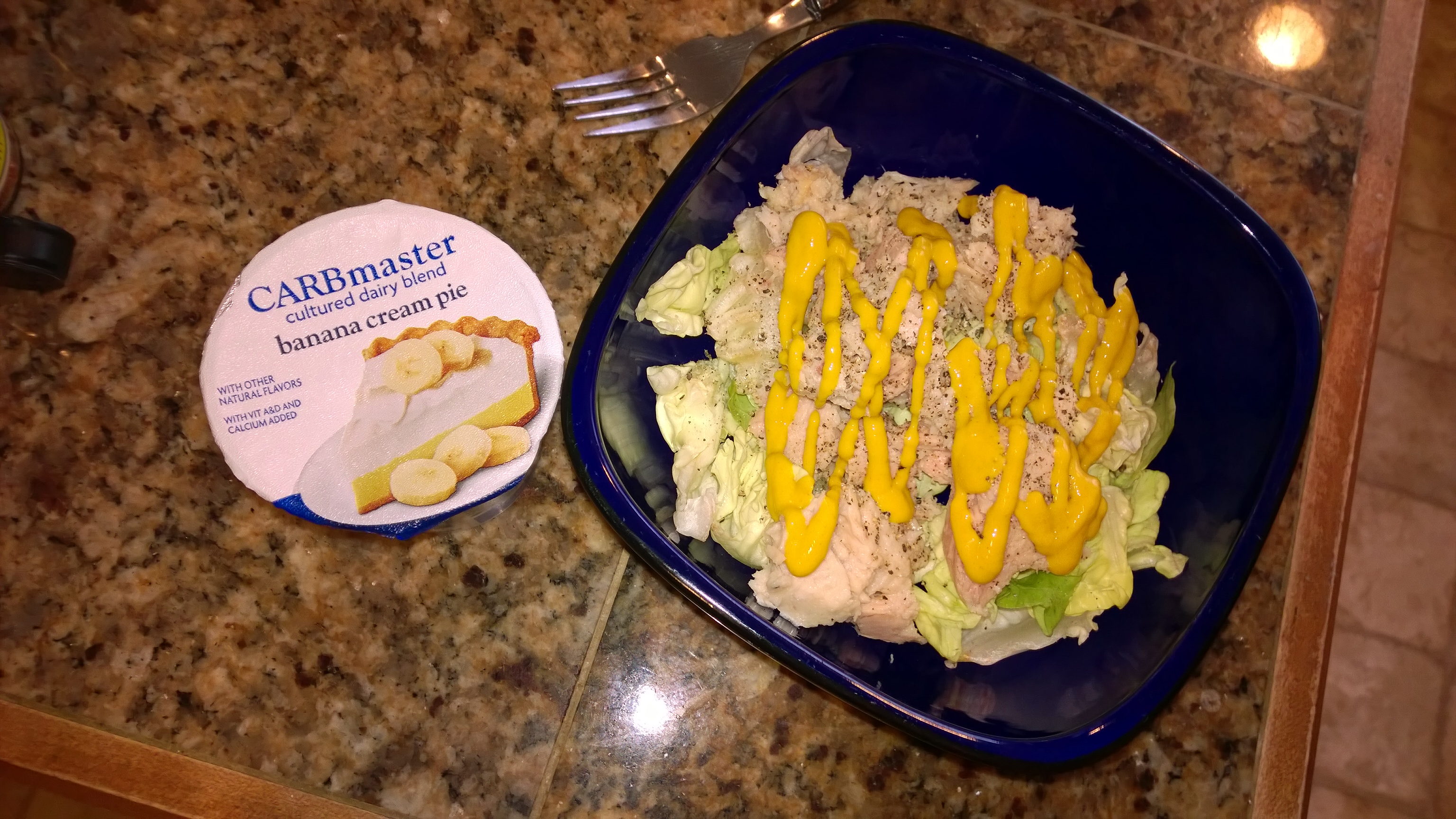 Full meal Published April 6, 2014 at 3072 × 1728 in Day of Eating 80 Carbs – Actually 60 Carb! ← Previous Next → Lunch time. Tuna, lettuce, mustard and a yogurt.