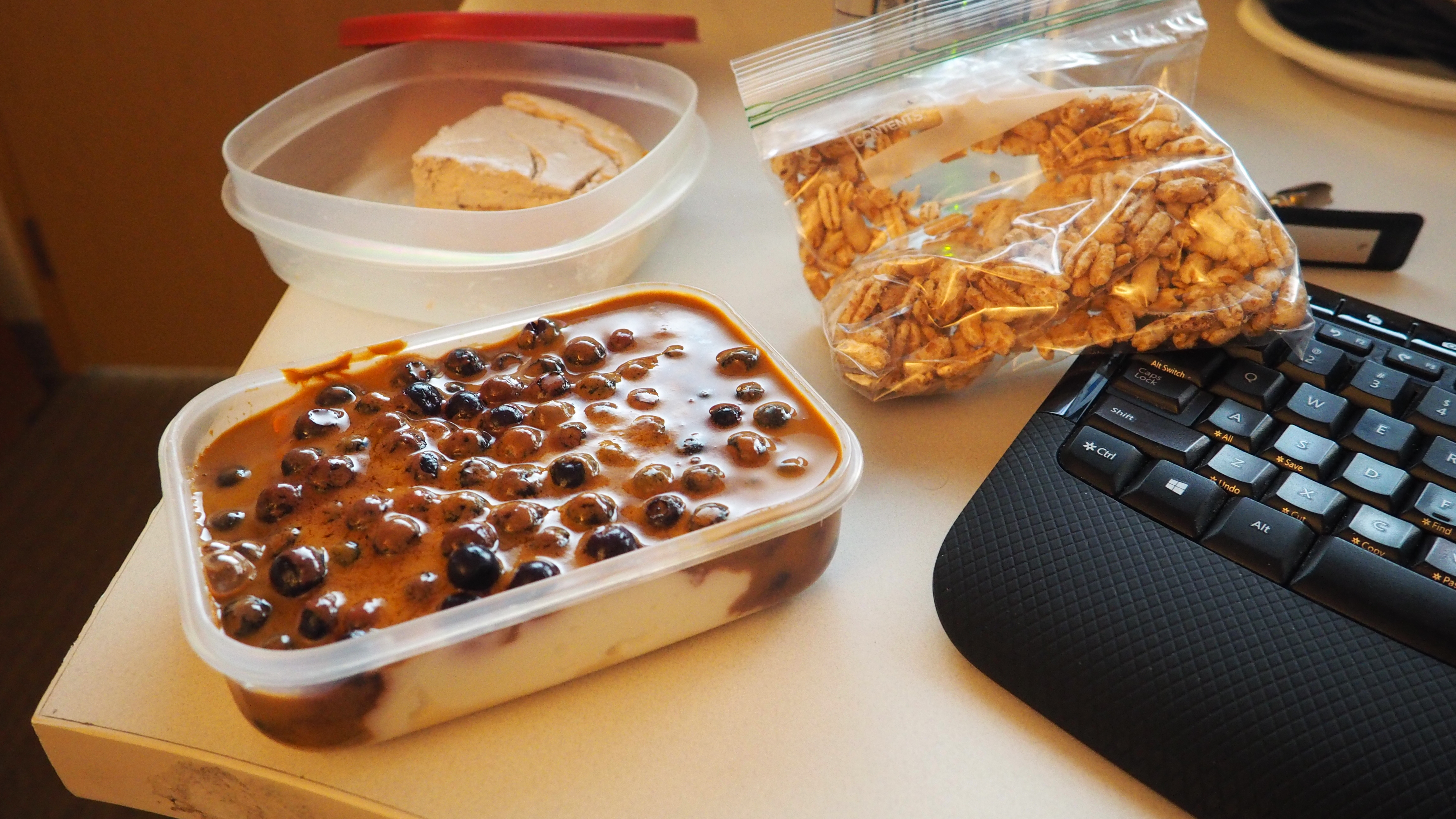 Greek yogurt, blueberries, MTS Whey, PB2 and some Walden’s Farms. Bag of puffed kamut and a slice of PB&J cheesecake.