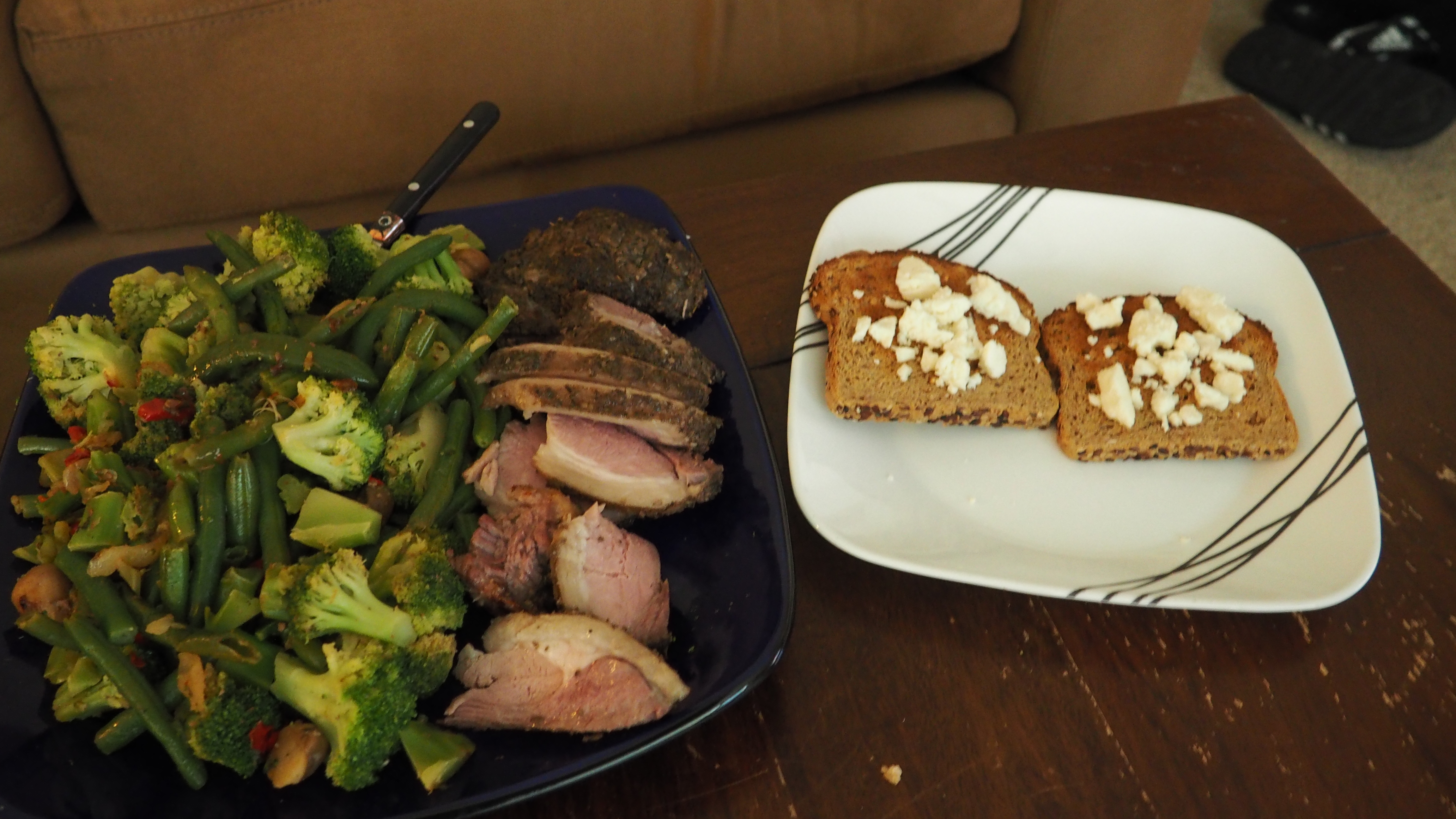 I had a snack of chopped liver and Kim’s Magic Pops but forgot to get a picture. Once I got home I started dinner to get my food in by 4:30. I cooked up a bunch of Asian veggies, 10oz of leg of lamb and server it with two more slices of bread and 28g of reduced fat feta cheese. After that I topped it off with a slice of TCBY Cookies and Cream pie.