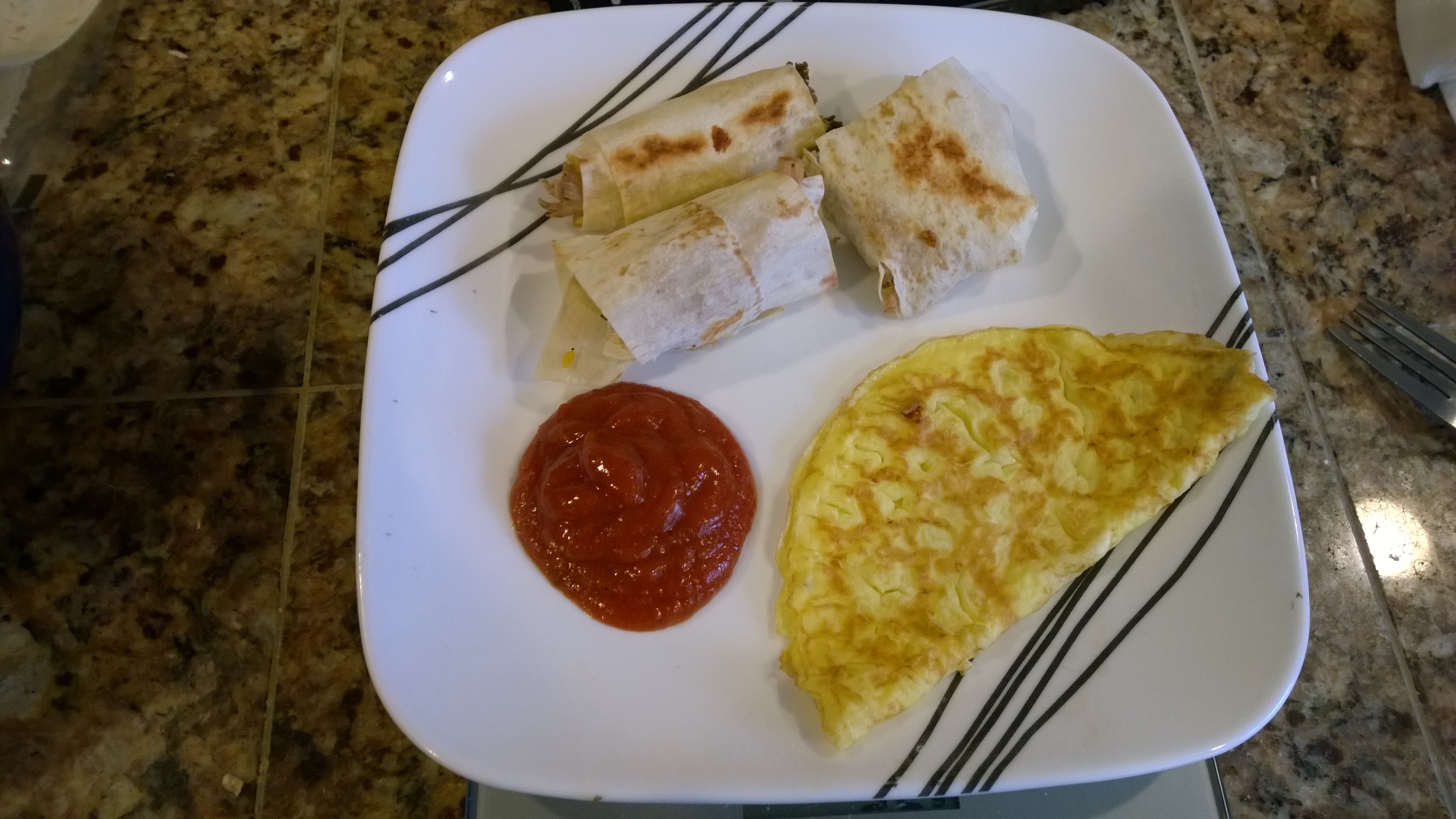Dinner Published March 14, 2014 at 3072 × 1728 Mountain Bread Oat filled with pork, cheese, and mushrooms, a side one egg omelet, and some marinara for dipping.